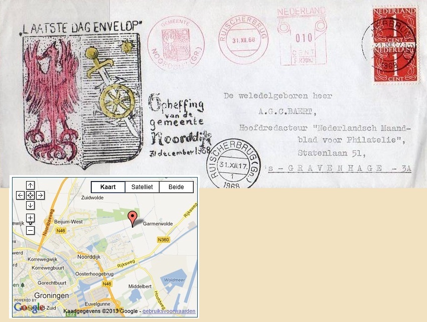 Noorddijk werd als zelfstandige gemeente per 1 januari 1969 opgeheven (het had toen ongeveer 670 jaar bestaan), Het kwam te vallen onder de gemeente Groningen. Het idee van een ‘laatste dag envelop’ was wel ludiek en mogelijk goed bruikbaar voor het moment dat ook de gemeente Noordwijk ophoudt als zelfstandige eenheid. Want dat hangt Noordwijk boven het hoofd: fusie en opname in een groter geheel van aanpalende Bollenstreekdorpen. Gemeentelijke herindeling heet het, maar het gaat voorbij aan de historische, sociale en culturele verschillen die iedere gemeente in zichzelf kenmerkt. Administratief kun je van alles samenvoegen, maar sociaal-cultureel is er vaak weinig van te maken.