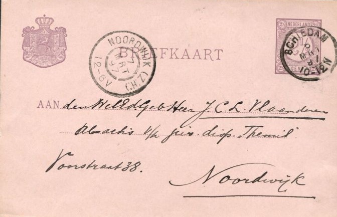De kaart is van maart 1897 en gericht aan J.C.L. Vlaanderen die toen abactis was van het juridisch dispuut “Themis” (dat volgens mij nog steeds bestaat). Het duidt er op dat Vlaanderen toen nog student was, maar zeker weten doe ik dat niet. In ieder geval duikt zijn naam later wel op als deskundige op het terrein van landbouwkredieten. In een publicatie van zijn hand staan de volgende volzinnen: