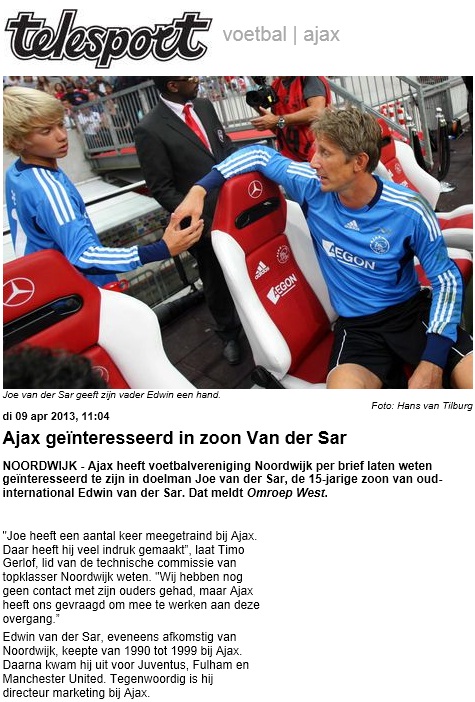Nu al schijnt Ajax interesse te hebben aan de zoon van Edwin van der Sar, keeper bij de C1 van Noordwijk. En daarmee verslaat de zoon de vader ruimschoots, want die werd pas in de A-jeugd ‘ontdekt’. Klik hier.