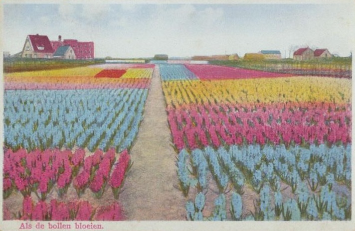 Deze hyacinthen staan mooi in bloei, zij het met enige hulp van het kleurpotlood. De kaart is in 1940 verzonden vanuit Noordwijk, maarhet is wat mij betreft niet zeker dat het beeld ook in Noordwijk geschoten is. De kleuren doen in ieder geval weldadig aan. Toen ik vorige week met de trein van Haarlem naar Leiden reisde, was de Bollenstreek grauw en grijs, met af en toe een narcissenveldje en langzaam ontluikende , maar zwakke hyacinthen. En we zitten al dik in april.
