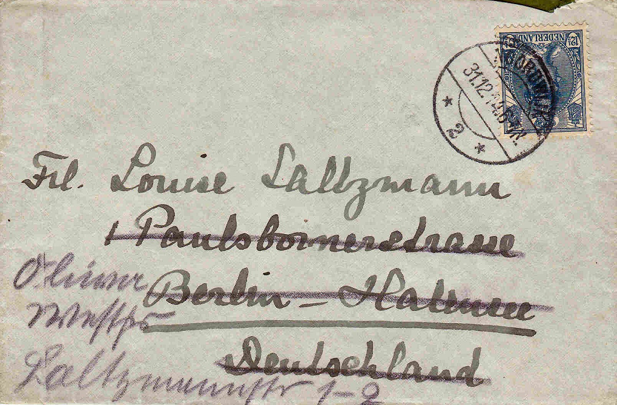 De brief werd op 31 december 1914 (!) afgestempeld op het postkantoor van Noordwijk en ging van daaruit richting Berlijn. Naar ene Louise Saltzmann, een vrouw die zich op internet moeilijk lokaliseren laat. Ze woonde niet meer op het adres dat was aangegeven: de Paulsbornerstrasse 1, op de hoek van de Brandeburgische Strasse in het tegenwoordige Charlottenburg-Wilmersdorf. In 1914 heette het hier nog ‘Berlin-Halensee’, vernoemd naar een nabijgelegen meertje richting Grünewald.