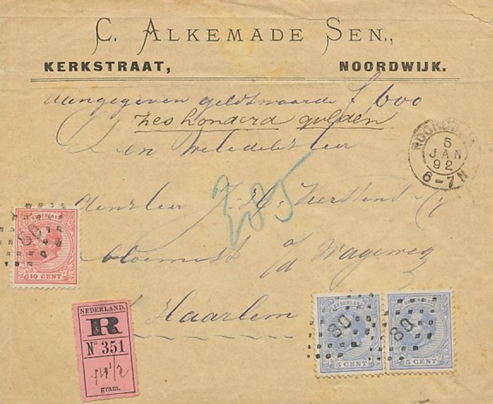 De aangetekende waarde was zeshonderd gulden, een heel bedrag voor die tijd. C. Alkemade Sen. uit de Kerkstraat was volgens mij een aannemer, maar de zending ging naar een bloemist in Haarlem. Wat werd er hier verhandeld?