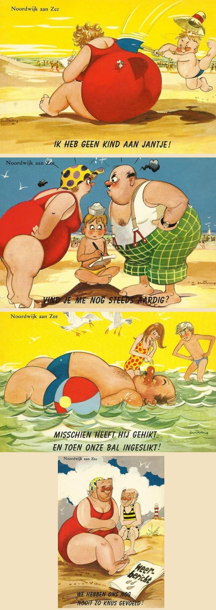 Ik weet niet in welke categorie je deze kaart moet scharen? Humor? Niet mijn kop van thee. Het is ook .een gemakkelijke kaart: één afbeelding met rechtsonder steeds weer een ander stempeltje: de ene keer ‘Noordwijk aan Zee’ , de andere keer ‘Scheveningen’ of ‘Zandvoort’. Maakt het allemaal nog droeviger eigenlijk.