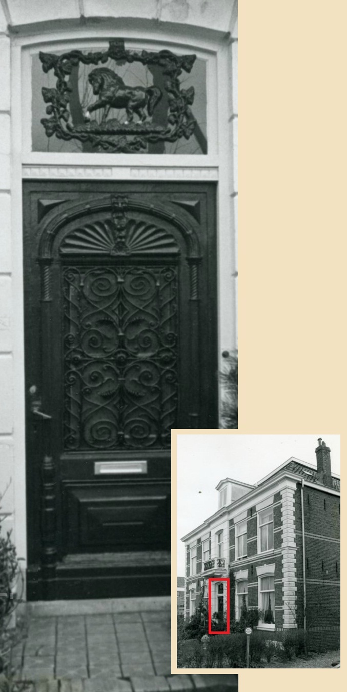 Wat me nu pas opvalt, is dat voor het bovenlicht bij de voordeur een prachtige smeedijzeren voorstelling was gemonteerd van een paard. Die voorstelling moet wel een bedoeling of een boodschap hebben gehad. Woonden hier vroeger paardenliefhebbers?
