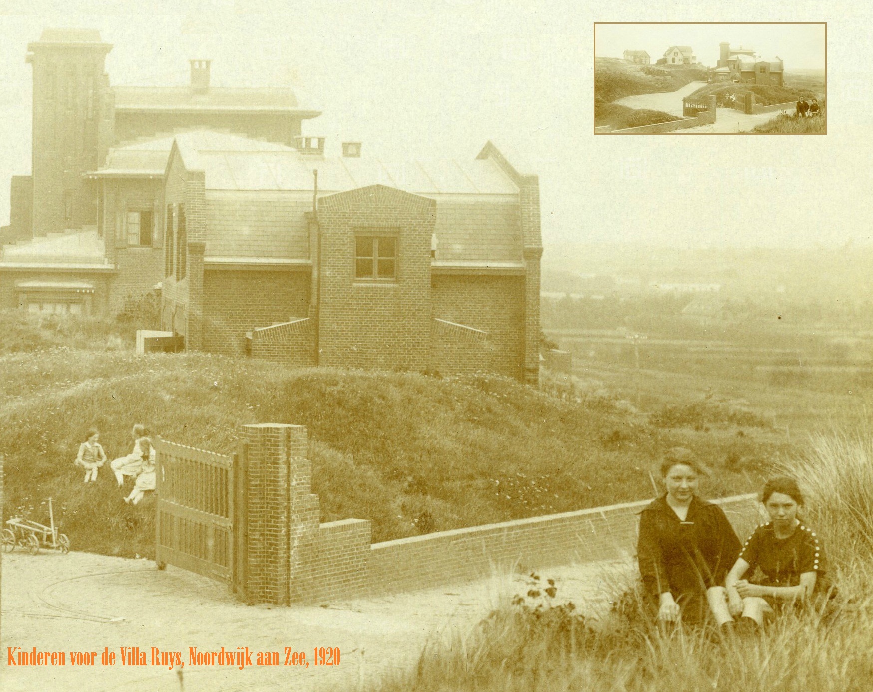 Weer zo’n prachtige foto uit het Regionaal Archief voor Leiden en Omstreken. In het pre-digitale tijdperk zijn de oudste foto’s vaak de scherpste, hoe kwam dat ook al weer? Het is wat mij betreft ook kwa compositie een geweldig beeld. Je zou denken dat vooral die prachtige, mastodontische Villa Ruys hier centraal staat, als een overtreffende trap tegen het duin aangevleid. Maar het zijn vooral die twee prachtige meiden, rechts op de voorgrond die het beeld bepalen. De rest is decor. Maar wát voor decor! Twee keer klikken en je waant je aan de Koepelweg in Noordwijk aan Zee rond 1920.
