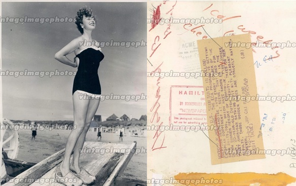 Noordwijk, Holland. The ECA program is getting (…) merchandise into every corner of the European continent, it seems. That goes for swimsuits, too, which have shown up in the Dutch summer resort of Noordwijk. Miss Jooske Pont (?), 20-year old beauty, tries on her finest Amerian bathing suit with pleasant results. Those wooden shoes are strictly national, however.