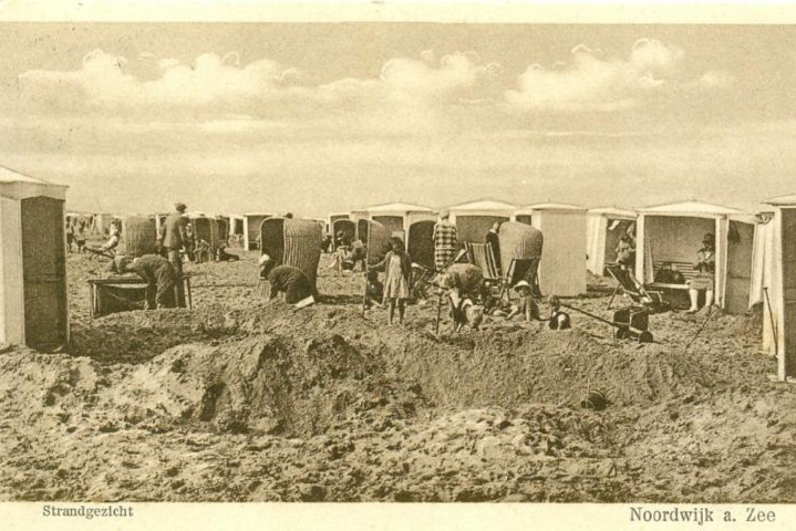 Op de een of andere manier lijken mij deze badhokjes of -banken of -stoelen niet echt des Noordwijks. Dat geldt voor de rieten strandstoelen eigenlijk ook een beetje (die zijn te breed, zou ik denken). De kuil is Duits, dat wel: ein Loch.