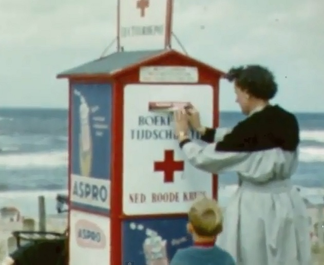 Het is een beeld uit één van die prachtige filmpjes die Kenneth Bestwell onlangs op YouTube plaatste. Ik schreef er eerder over. Het is het beeld van de Roode (sic!) Kruis Bus voor boeken en tijdschriften. Die konden hier worden ingeleverd en werden dan verspreid onder de hulpbehoevenden en de zieken. Recycling avant la lettre. Hij stond tussen de viskar van Caspers en de ijskar van de Groko, bij de strandafgang voor het Palace Hotel. Gesponsored door Aspro, een asperinesoort die de hoofdpijnen eerder liet toe- dan afnemen 🙂