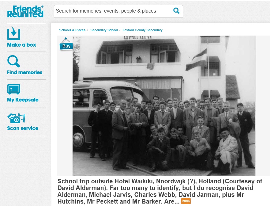 Friendsreunited.com is een Engelse site, die een beetje vergelijkbaar is met ‘schoolbank’ in Nederland, maar er wordt in Engeland nog wel meer nostalgie aan vastgehangen. Er staan verschillende foto’s op van Engelse schoolreisjes naar Nederland, ook Noordwijk. Dit is er één van: uit 1958.