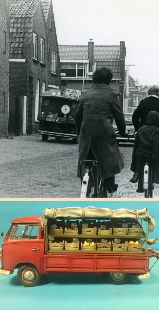 In mijn herinnering hadden vrijwel alle groenteboeren in Noordwijk zo’n type VW als het model op de onderste foto, zij het – later – iets luxer van uitvoering. Maar altijd zo’n hangende weegschaal op het achterplat, die lustig slingerde als de auto weer een paar meter verder reed. Je had een hele serie “Van der Meeren”, uit de Kerkstraat, de St. Jeroensweg (“De Vitaminebron”) en de Voorstraat (“Theo – De Stek – Van der Meer” ging later naar Zee, naar de Albert Verweystraat), een Salman uit de Tramsteeg en Jaap Augustinus uit de Bronckhorststraat.
