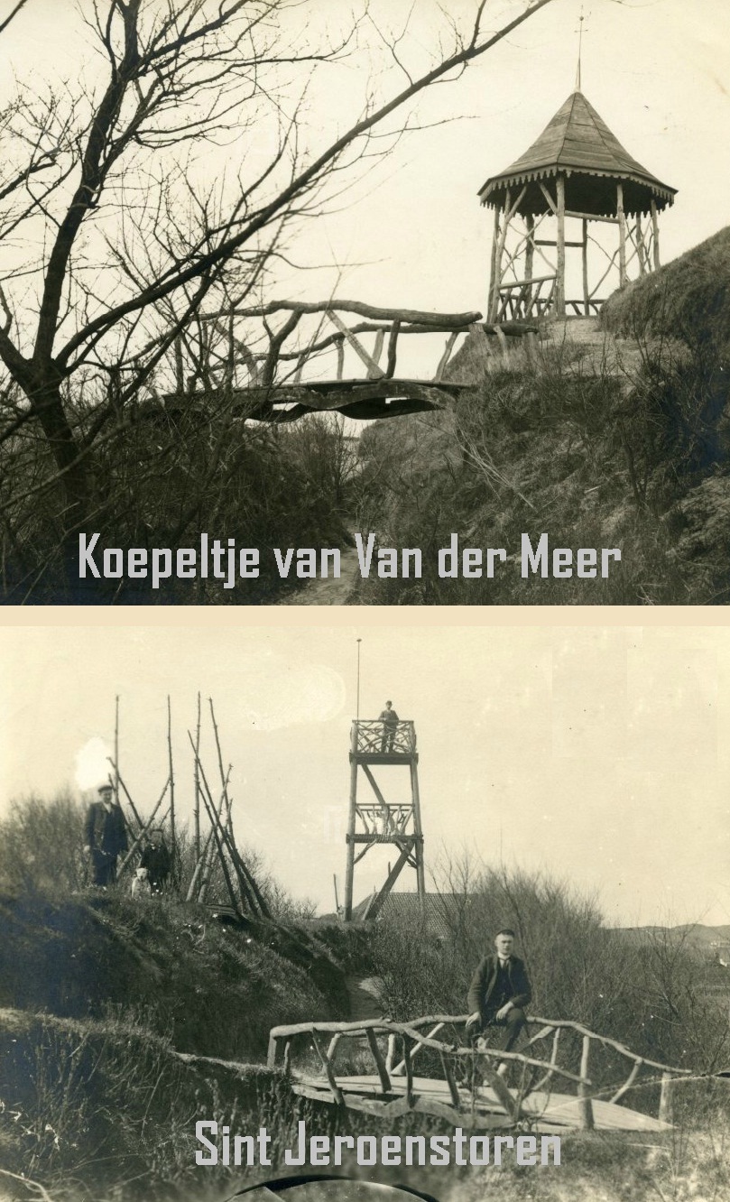Maar toch wordt op deze ansichtkaart het geheim een beetje ontsluierd. Aan de rechterkant ziet men een stukje van het dak van het huis Winterrust, dat aan de St. Jeroensweg is gelegen. Nu wonen er twee families Braun. Er is nog een ansichtkaart van dit plekje uitgegeven, ± 5 jaar later. Daar wordt gesproken over de Belvédère op de St. Jeroensberg. Dan wordt het ongeveer wel duidelijk waar dit plekje ligt: de St. Jeroensweg. Dit terrein was eigenlijk een uitloper van het landgoed Calorama, dat voor de oorlog groter van omvang was dan thans. Na de oorlog werd een gedeelte langs de oude St.Jeroensweg met nieuwe huizen bebouwd, hetgeen ten koste ging van het landgoed Calorama. Zelfs het St. Jeroenspoortje moest een stukje naar achteren worden verplaatst. Iets ten noorden van het landgoed Calorama lagen aan weerszijden van de St. Jeroensweg de bollenpercelen van de familie van der Meer, die nog steeds woont op de splitsing Boerenburgerweg/St. Jeroensweg. Een oude houten schuur aan de St. Jeroensweg doet nog aan deze tijd herinneren. Al voor de oorlog werd een gedeelte van dit bollenland verkocht voor de bouw van woningen aan de Van Leeuwenstraat en de Bijdorpstraat. Aan het einde van dit bollenland aan de rechterkant lag een stuk binnenduin en juist op dit stukje duin was op initiatief van de familie Van der Meer deze toren neergezet, van waaruit men een prachtig uitzicht had over de bollenvelden, die zich hier naar alle kanten uitstrekten. De Van der Mortelstraat, ’t Joostje en de wijk Boerenburg bestonden nog niet. Een stukje achter deze toren stond een eenvoudige koepeltje, ook wel het koepeltje van Van der Meer genoemd. Daar kon men even beschut zitten en eveneens van het uitzicht genieten. Rond 1910 kwam aan dit mooie plekje een einde. Van der Meer, die de eigenaar was van deze plek, liet de St. Jeroensberg afgraven en voegde deze geëgaliseerde plek bij zijn bollenland, dat er naast lag. De St. Jeroensweg was toen in z’n geheel een fraaie weg, die slingerde tussen het bollenland en de bosrand en uiteindelijk uitkwam op de Gooweg, ongeveer ter hoogte van de Northgodreef. Achter de St. Jeroensberg passeerde men de R.K. Begraafplaats. Op het ogenblik houdt de St. Jeroensweg op bij de Van der Mortelstraat, maar toen kon men daar nog gewoon doorlopen. Voordat de St. Jeroensweg eindigde bij de Gooweg kwam men langs een soort industriegebouw, waar aan het eind van de 19e eeuw groenten werden ingeblikt. Aan het begin van de vorige eeuw kwam hier de beroemde aardewerkfabriek De Kroon, die helaas na enkele jaren alweer failliet ging. Uiteindelijk kwam hier een speelgoedfabriek, die echter in 1913 geheel uitbrandde. Op het ogenblik staan hier de oude woning van burgemeester Van der Mortel en enkele voormalige kantoorgebouwen van het Zilveren Kruis, die nu gedeeltelijk in gebruik zijn bij de gemeente.