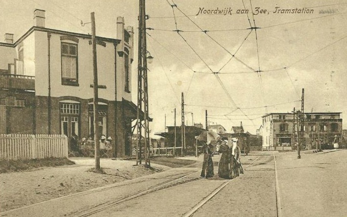 Misschien waren dit wel dames met een hoge portie liefdesverdriet, die daar gezamenlijk en in deemoedige afwachting uitkeken naar het moment dat de aanstormende Blauwe Tram uit Leiden hen zou verpletteren. Ze hadden daartoe plaatsgenomen op een plek waar de tram hen niet kón missen: de wisselstrook bij het eindpunt. Als het te lang zou duren, konden ze altijd nog tussentijds een kop koffie halen en een gevulde koek eten in de restauratie van dit stationnetje of een glaasje ranja bij Bar Terminus. De fotograaf heeft het moment supreme niet afgewacht, wat jammer is. We weten nu niet óf het uiteindelijk ook daadwerkelijk met hen gebeurd is of niet.
