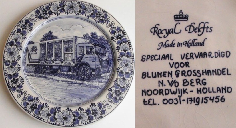 Het is toch een beetje een gek gezicht: ik associeer Delfts Blauw toch vooral met klassieke voorstellingen als klompen, tulpen, een oude zeevaarder en een molen. Hier staat een moderne vrachtwagen afgebeeld en op de een of andere manier strookt dat niet met het beeld dat ik heb. Van de andere kant: voor een bloemenkoopman is het vast en zeker een aardig relatiegeschenk en zo zal het ook wel bedoeld wezen.