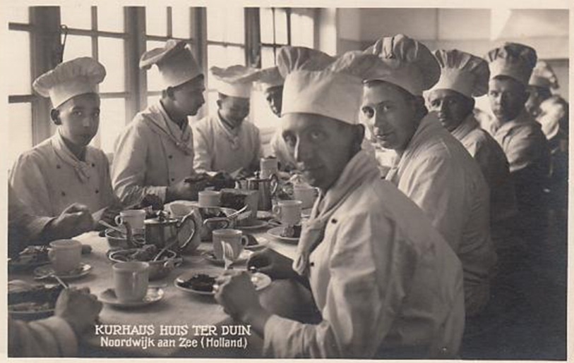 witte keukenbrigade …echte koks met franse communicatie en echt alles bereiden geen instant en blikjes en zakjes…toen nog echt vak,..de chefkok was de patroon dictator…ter plaatse,..hoor ze nog schreeuwen uit de hotels keuken fifties toen de elite er was…woonde achter noordzee …keuken,..als je door dorp liep had je bij hollander en hoek …landbouw…palace en zeeleeuw en seinpost zo een keuken discipline waar de chefkok aan t hoof tafel zit en links de koksmaatjes en rechts de sous chefs…bij noordzee had je beke die hoorde drie straten verder en bij palace herwaarden die gooide als die kwaad was en bij landbouw stevens die gaf franse knopen..en bij de zeeleeuw hulscher de vuurvreter dat was wat …zat wel eens eens een kok maatje over strand achterna..mooie tijden onder druk werkte ze net als ramsey …zo druk was t…alles tegelijk..de chef was de baas ook de eigenaar had niks te zeggen…koud en warme buffetten ..pasteitje of gebraden eend of aan rt spit …alles kon bij de sjiek en de champagne feesten..mn broertje en ik levere de flessen in,…