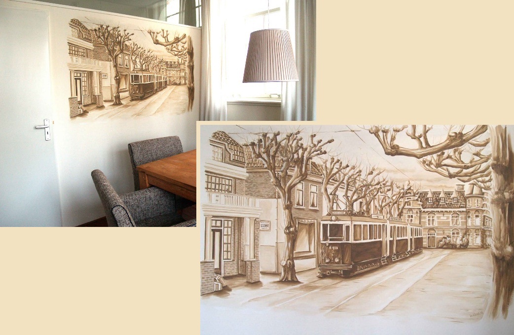 Het is geen graffitti, maar een tekening aan de muur van het kantoorpand aan de Voorstraat, waar nu een advocaat haar praktijk heeft. Het kantoorpand is het oude wachtlokaal van de Blauwe Tram, die hier stopte op weg naar Leiden en Den Haag (en niet op weg naar Noordwijk, zoals de tram abusievelijk vermeldt!). Het oude wachtlokaal en die tram staan er mooi op afgebeeld. Het is helemaal een mooie tekening. Van kunstenares Marleen Dijkdrent.