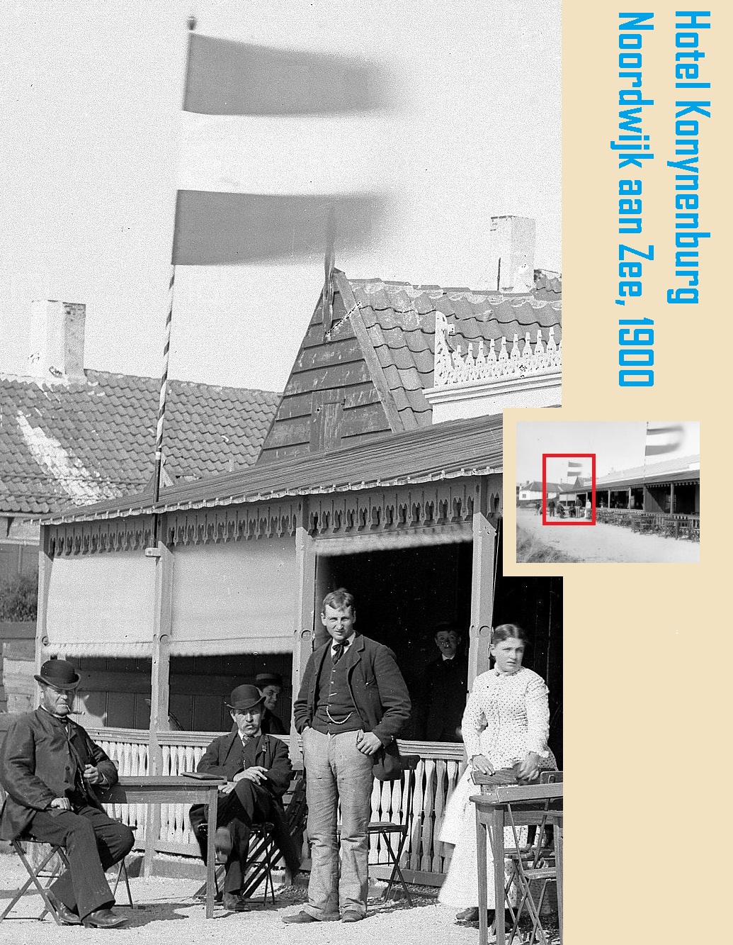Het zou mooi zijn om te weten wie er op de foto staan, maar de bijschriften in het Regionaal Archief Leiden e.o. vermelden helaas geen namen. Wel zeker is dat het hier een foto betreft voor het etablissement van Konijnenburg op de plek van het huidige Gat van Palace. Het lijken me een stel notabelen, onder wie misschien Konijnenburg zelve. En rechts misschien diens dochter Adriana, die de hoofdrol speelt in het boek “Vloed” van Susan Smit.