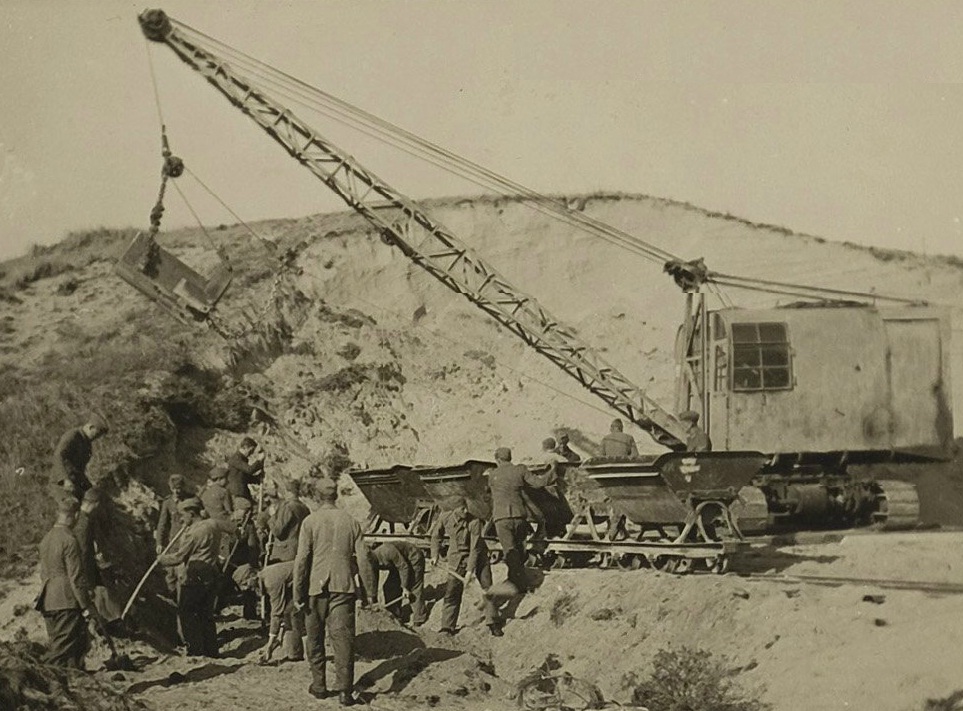 hier zijn ze bezig met het uitzetten profiel maw het traject wat gevolgd moet worden voor de gang die naar het kazemat gebeuren liep…dragline zat een nw er op…en er werkte bij de wehrmacht en ned. aannemers tientallen mensen uit dorp en streek…of het was in duin werken of arbeids einzets duitsland…toen het werk 1943 klaar was moest men alsnog via douzastr naar mofrika…org todt was hfd …nw ers storten wel beton ….zo goed dat t nu nog staat…die agenten op vorige foto haalde nw ers van huis voor duitsland,…