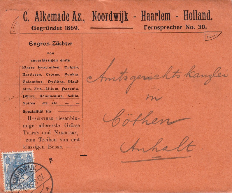 Waarom C. Alkemade Azn zich per post richtte tot de Amtsgerichtskanzlei aldaar kan ik niet achterhalen. Misschien dacht hij er een partij hyacinten te kunnen leveren, “riesenblumige, allererste Grösse.”