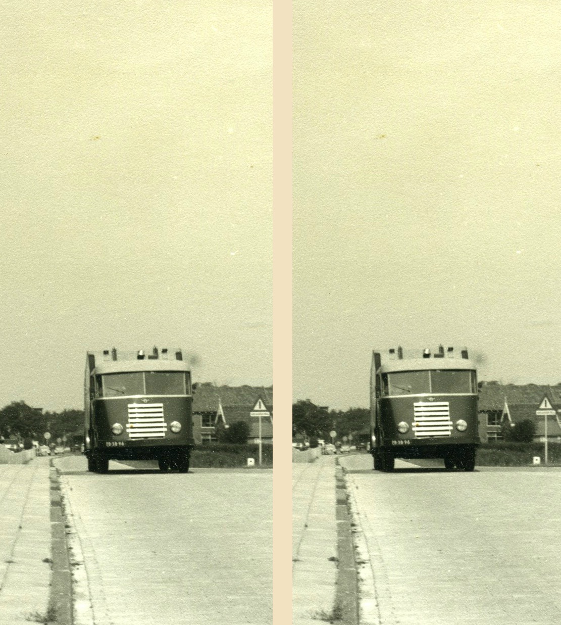 Nota Bene: ik krijg nog een foto aangereikt van Facebook.com. Het stuur zit inderdaad rechts en het is Jan Bierman die achter het stuur zit. Wie zijn collega’s zijn op de voorgrond, weet ik niet. In ieder geval staat Frans Groenewoud er niet op, in tegenstelling tot berichten van medelezers (sorry Klaas, maar Frans was twee koppen groter dan deze types).