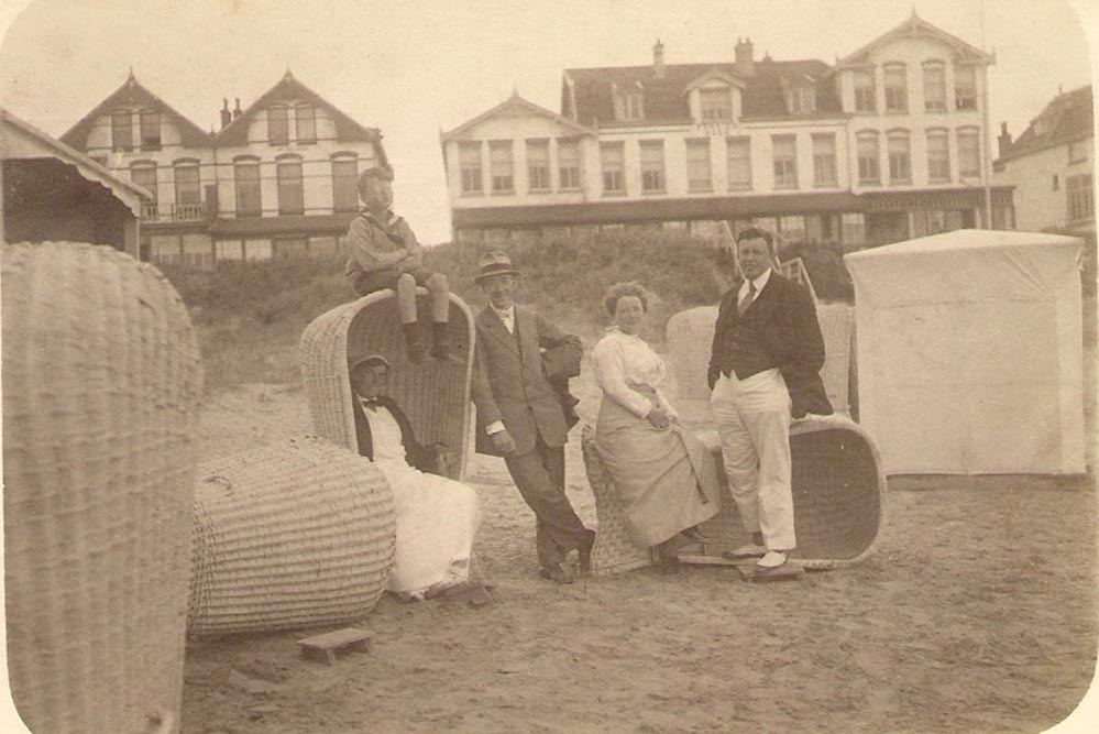 Het ziet er eigenlijk niet uit: een paar omgevallen strandstoelen en wat ongesorteerd publiek op en tegen en in die stoelen. Maar het maakt wel een vrolijk beeld. Aan de boulevard is het pension van Hugo Hoek nog lang niet aan zijn laatste verbouwing toe.