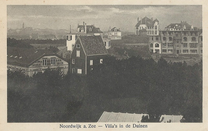 Het beeld kende ik nog niet. Het biedt een heel andere kijk op het ensemble aan gebouwen dat stond opgesteld in het delletje achter Pension Verloop. Op de voorgrond is nog net een stukkie te zien van het dak van de laiterie. Daartegenover het pand van Tappenbecks Blumenschwiebelnhandel en het pand Oud-Holland. Dat laatste heeft ook nog op andere plekken gestaan. Het was een soort van prefab-paviljoen, dat als bierhuis dioenst had gedaan op de Wereldvoedseltentoonstelling van 1887 in Amsterdam. De Tappenbecks vonden het wel een lollig idee om het geheel te verhuizen van het Amsterdamsche Museumplein naar de Noordwijksche bushbush. https://hetnoordwijkblog.wordpress.com/2011/09/22/flash10-oud-holland-again/