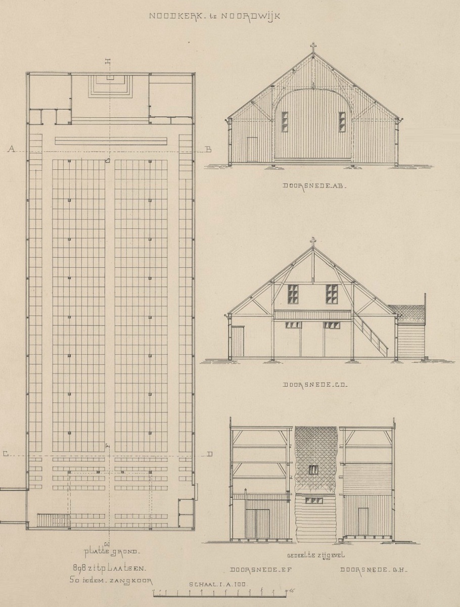 Het is een ontwerp van een noodkerk in Noordwijk uit 1889. Ik weet werkelijk niet of en waar dat kerkje uiteindelijk is neergezet. Met de bouw van de nieuwe katholieke kerk op Binnen was men al begonnen en de noodkerken (aan de Kerkstraat en later ook nog aan de Lijnbaanweg) waren al grotendeels verlaten. Was het een ontwerp voor een katholiek kerkje op Noordwijk aan Zee, als een soort van missiestatie ter bekering van het overwegend protestantse visserijwezen? Of was de kerk juist bedoeld voor dat onbekeerde protestantse visserijwezen?