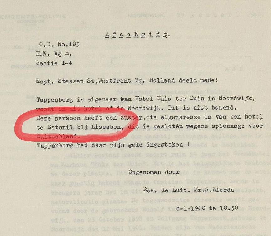 Ik kan nergens vinden dat Wolfgang Tappenbeck een zuster had. Die zou een hotel hebben gedreven in Estoril, Portugal en daarmee was al in januari 1940 blijkbaar van alles mis. Het is een intrigerend verhaal, dat schreeuwt om nadere uitvorsing, maar daar kom ik later misschien nog wel op terug. Ik weet alleen dat Wolfgang op enig moment overleed in ………. Portugal. That’s all. O ja, het hotel was Hotel Atlantico in zijn oorspronkelijke, rustieke vorm. Tegenwoordig is Atlantico in Estoril een giga-complex aan appartementen. Het lijkt Huis ter Duin wel. In bovengenoemd afschrift wordt – slordig genoeg – gesproken over Tappenberg ipv Tappenbeck.
