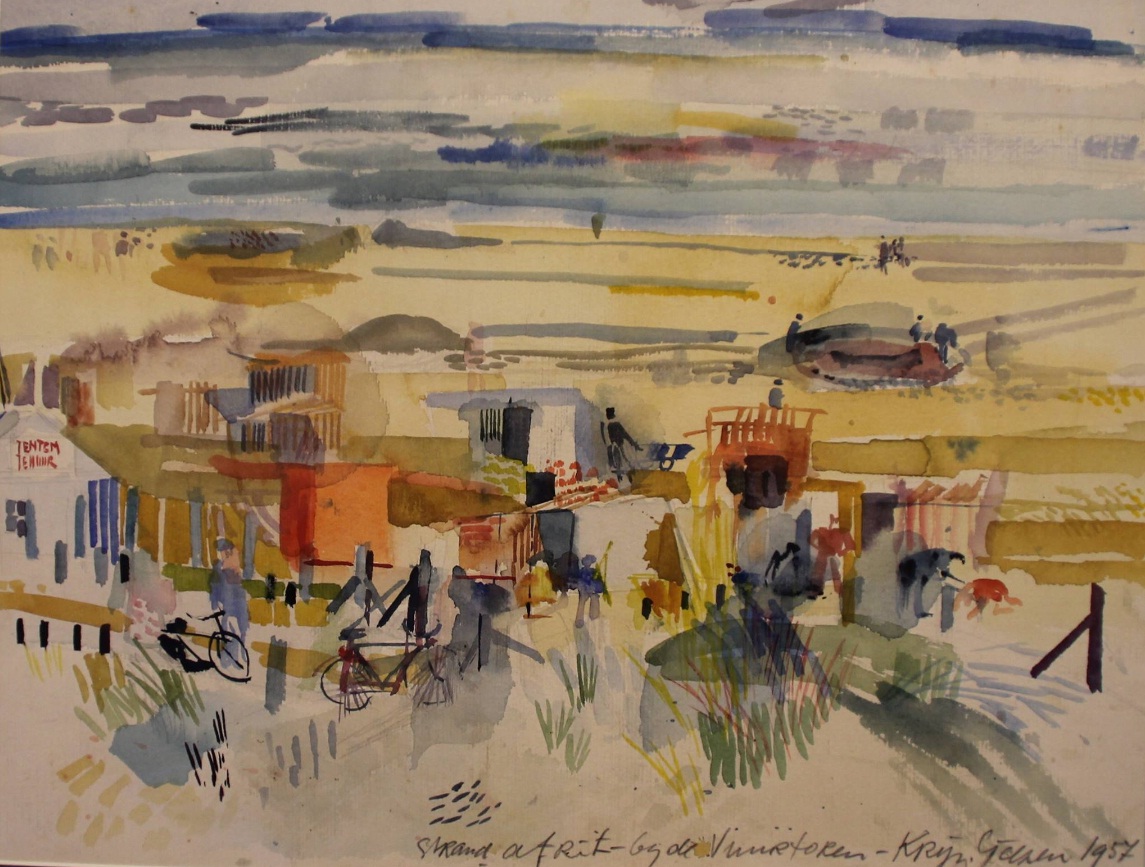 Een nieuwe tentoonstelling – en vast een hele mooie – vanaf volgende week in Museum Noordwijk: vijf Noordwijkse kunstenaars, vijf vrienden van vroeger. Als voorproefje alvast dit prachtige aquarel van Krijn Giezen uit 1957: “Strandafrit bij de Vuurtoren”.