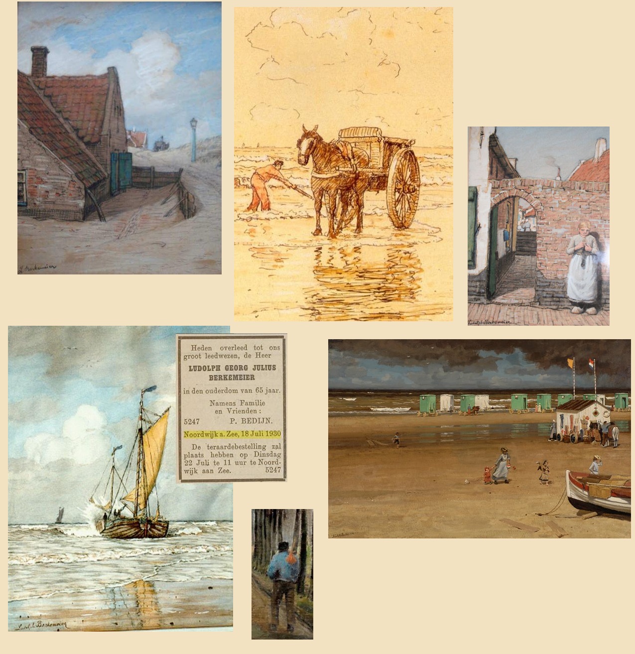 De foto is van Braakman (“Schiestraat 9 Noordwijk”) staat er nog rechts onderaan op de foto) en is genomen ergens rond 1900. De afgebeelde persoon is niemand meer of minder dan de ‘Noordwijkse’ kunstenaar Ludolph Berkemeier (1864-1931), die meerdere geschilderde beelden van Noordwijk voor zijn rekening nam. De foto bevindt zich in het bezit van het Rijksbureau voor Kunsthistorische Documentatie in Den Haag. Daar zijn nog wel meer ‘Noordwijkse beelden’ te vinden, geschilderd of gefotografeerd. Hieronder een collage van zijn schilderijen, die eerder in dit blog ‘langs kwamen’.