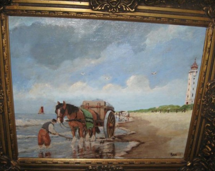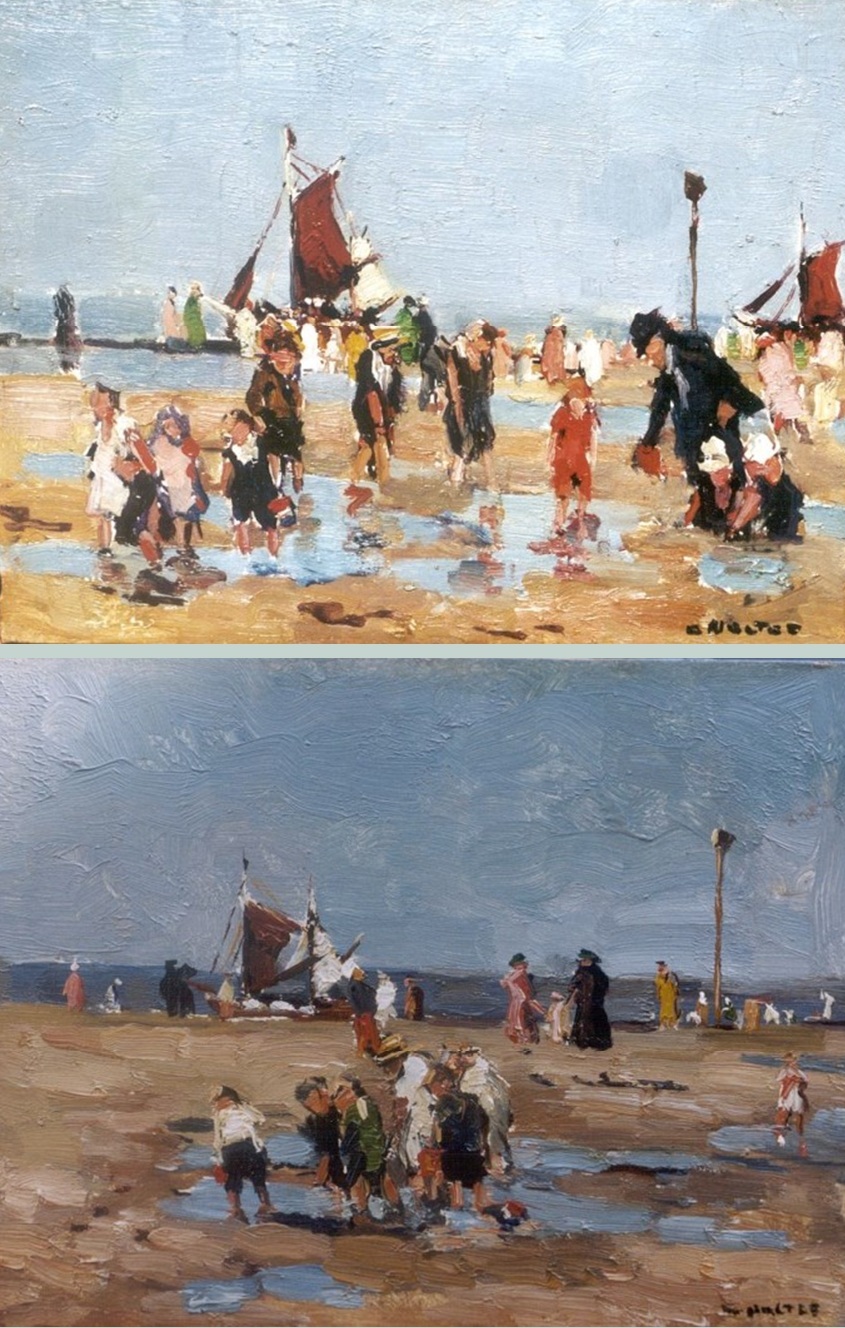 Op marktplaats is dit schilderijtje te koop van de Dordtse schilder Cornelis – Cor – Noltee. Noltee schilderde veel stadsgezichten van Rotterdam en Den Haag, maar ook stillevens. En dus ook (heel) af en toe een strandgezicht. Naast het bovenstaande schilderij behoorden tot dat genre ook twee versies van “Pootjebadende Kinderen aan het Strand”. Ik neem aan dattie die ook in Noordwijk heeft geschilderd, want deze drie taferelen zijn de enige strandgezichten die ik van hem heb gevonden en hij zal er niet apart voor naar verschillende badplaatsen zijn gereisd.