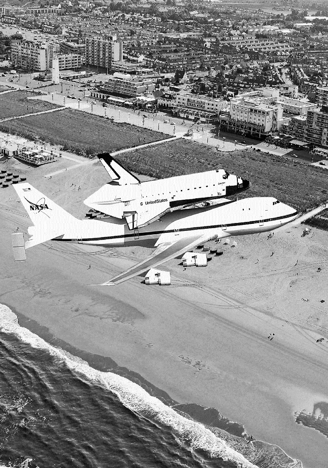 In de meest recente Blauwdotter staat een aardig verhaaltje, dat hier ook wel eens is verteld, over de vlucht van een Boeing747 met op zijn rug het NASA-ruimteveer ‘Enterprise’. Die twee vlogen op zondag 3 juni 1983 laag over de Nederlandse kust en dus ook over Noordwijk. Van dat moment waren vrijwel geen foto’s beschikbaar, gek genoeg, want ik herinner me dat er toch veel Noordwijkers op de been waren, die zondag, met een fototoestel in de hand. Maar bij gelegenheid van het verschijnen van deze laatste Blauwdotter wist redacteur Paul Berkhout posthuum en alsnog een ongelooflijk mooie foto te vinden.
