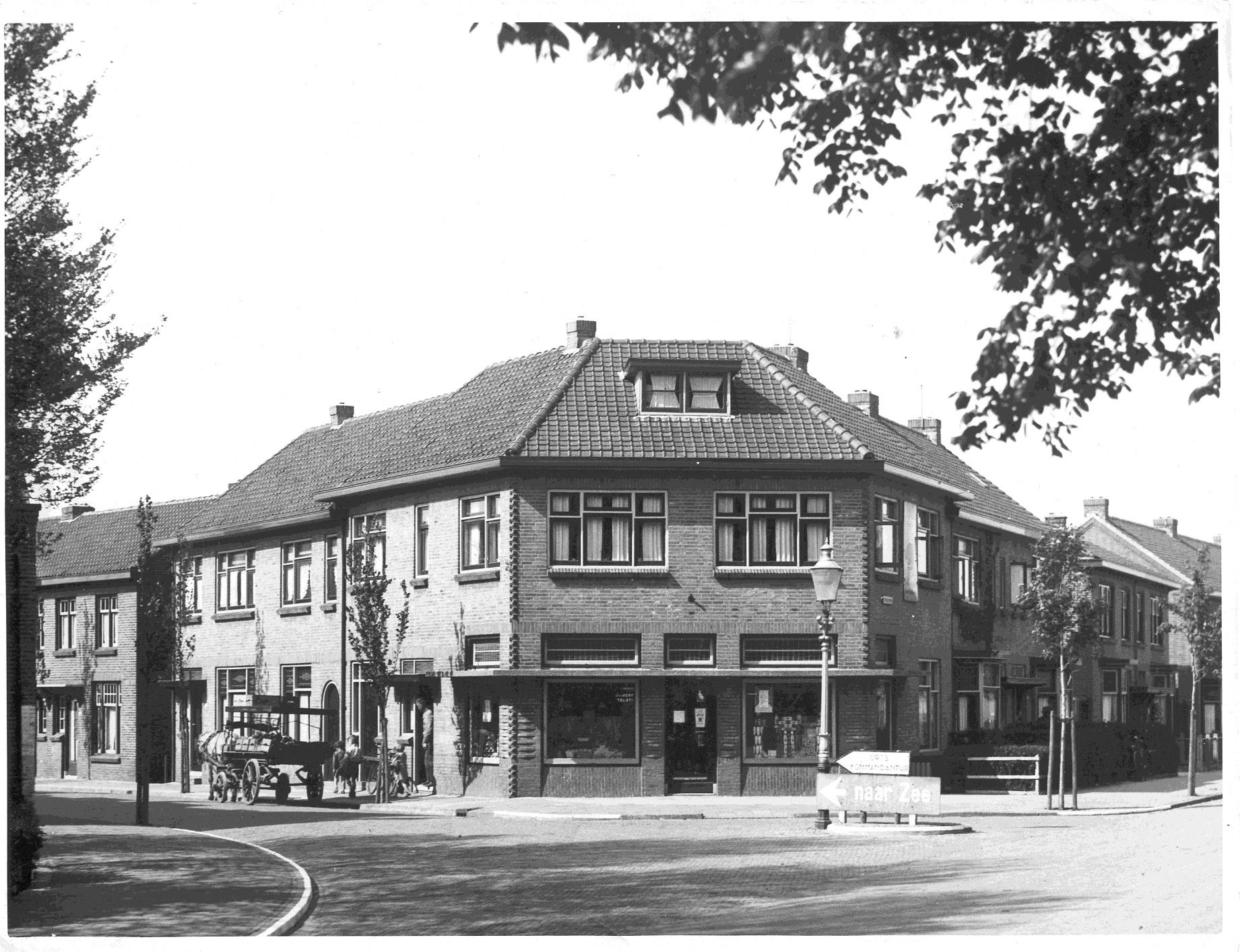 Deze foto is van in de oorlog. Weinig verkeer en weinig mensen op straat. Het voor deze plek typerende bord “Naar Zee” stond er al wel, maar daarbovenop staat een ander bordje: “Ortskommandantur” staat erop (klik 2x op de foto). Blijkbaar zaten de Teutonen richting Noordwijk aan Zee, misschien in de IJmuiderstraat, waar hier nog paard en wagen staan gestald. Ik weet het niet. Waar was de Ortskommandantur Noordwijk?