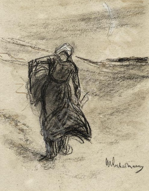 Ik ga bij mezelf bijna denken: als je geen inspiratie hebt, kun je er altijd nog een Liebermannetje doorheen gooien. Maar dat is te gemakkelijk en doet te weinig eer aan het werk van deze grote Duitse schilder. Ook deze tekening in houtskool, bijvoorbeeld, is in al haar eenvoud ontzettend sprekend. “Vrouw in de Duinen”, één keer raden waar Liebermann de inspiratie ontving voor zo’n prachtig beeld.
