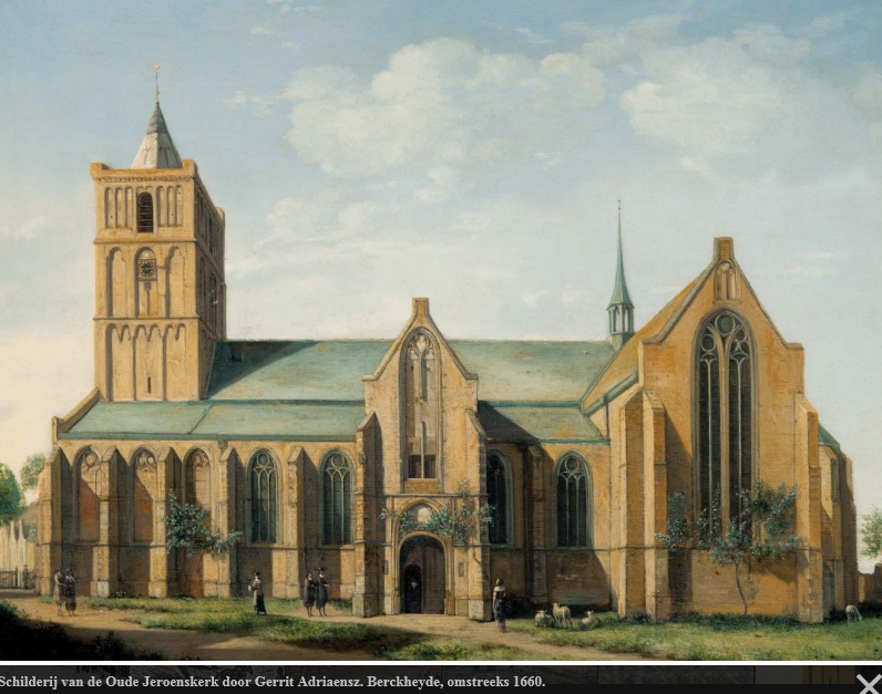 Uit de Wikipedia: Gerrit Adriaensz. Berckheyde (Haarlem, 6 juni 1638 – aldaar, 14 juni 1698) was een Nederlands kunstschilder. Hij is vooral bekend van stadsgezichten, voornamelijk van Haarlem, Amsterdam en Den Haag en van alles er tussenin. Gerrit was de zoon van een slager, afkomstig uit Katwijk. Hij werd tot schilder opgeleid door zijn oudere broer, Job Berckheyde en door Frans Hals. Na 1654 (?) werkten de beide broers een tijd in Rhenen, Kleef, Keulen, Bonn, Mainz, Mannheim en Heidelberg voor de Keurvorst van de Palts. Omstreeks 1660 keerden zij naar Haarlem terug waar ook Gerrit lid werd van het Sint-Lucasgilde, de beroepsorganisatie voor schilders. Vanaf 1660 schilderde Berckheyde vrijwel uitsluitend stadsgezichten en hij wist, ondanks een grote productie, een hoog niveau te handhaven. Johannes Lingelbach en Jan van Huchtenburg stoffeerden zijn schilderijen met figuren. Tussen 1666 en 1681 waren beide broers lid van de Rederijkerskamer. In 1680 betrokken zij een huis naast de Grote of Sint-Bavokerk. Gerrit verdronk in 1698 in de Haarlemse Brouwersvaart, nadat hij een herberg had verlaten en een omweg wilde vermijden (hij zal wel een beetje teut zijn geweest).
