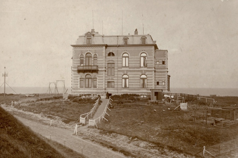 Weer zo’n heldere glasplatenfoto van vroeg-Huis ter Duin, de schepping van de Amsterdamse stadsarchitect A. Weismann. Op het erf is het nog een rotzooitje met een paar galgen, een Gamma-huisje, een kippenhok en een hekje dat weinig dienst doet. Op de voorgrond loop het spoor van de stoomtram die reed tot aan de kop van de Zuidboulevard. The Beginning Of It All.