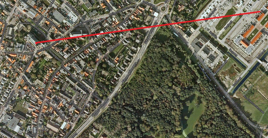 Aanvankelijk dacht ik: er kan helemaal niets van kloppen, van dit schilderij van Leo van den Ende. Om te beginnen moeten we alvast maar vergeten dat het hier om Noordwijkerhout gaat, zoals het onderschrift meldt. Het is een overduidelijke poging om hier de beide torens van Noordwijk Binnen te vereeuwigen. Maar ik dacht dat het hele perspectief hier niet klopte. Ik haal er googlemaps bij en zet een lijntje uit. En dan klopt het wel. Ik kan me alleen niet erg herinneren dat er zoveel bloeiende tulpenvelden waren aan geune kant van de Schiestraat. Er was meer bebouwing, maar dat weet ik niet zeker.