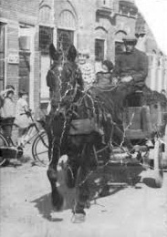 Op de site van het vervoersbedrijf van de Gebr. Van der Putten (‘vanaf 1921”) staat en prachtige foto van één van hun eerste transportmiddelen, een eerlijke paard en wagen. Jammer genoeg is de foto een beetje arremoeiig gescanned, waardoor ik ‘m niet verder kan uitvergroten. Maar ik geloof dat ik desondanks wel kan vaststellen, waar deze paard en wagen (en voerman) zich bevinden: in de Bronckhorststraat in Noordwijk-Binnen, voor het majestueuze pand, waar in mijn tijd ene Van der Meer zijn scepter sloeg. Een raar pand ook, want het stond niet haaks op de rooilijn en kreeg daardoor twee schuine gevels aan de voorzijde. Van der Putten en zijn peerd gingen er onverstoorbaar aan voorbij.