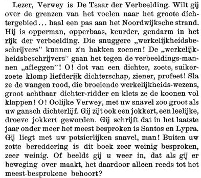 een zeegod is Verwey nog lang niet,____tenzij Noordwijksch stranden ook roode hallucinaties van overgrooten waan vangen tusschen zoet golfgeruisch, en een brandend roem-verlangen van een eenzame ziel naar aardsche oorden heenfluisteren!
