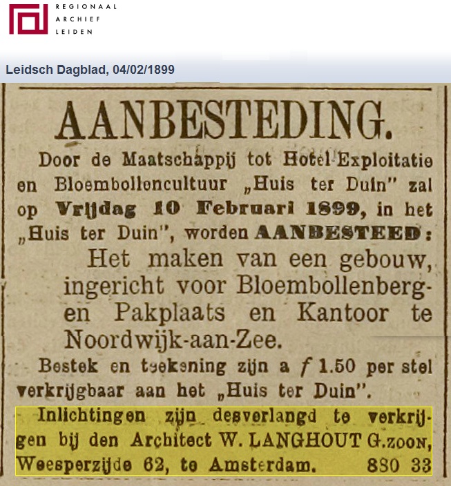 Curieus is natuurlijk wel dat dit kaartje uitging – afgestempeld en al – op de eerste dag van het laatste jaar van de 19e eeuw. Het werd verzonden door de directie van Huis ter Duin aan de architect W. Langhout Gzn. aan de Weesperzijde in Amsterdam. De achterkant van het kaartje is niet afgedrukt op internet, maar toch kan ik wel raden waarover het ging. Hierover: