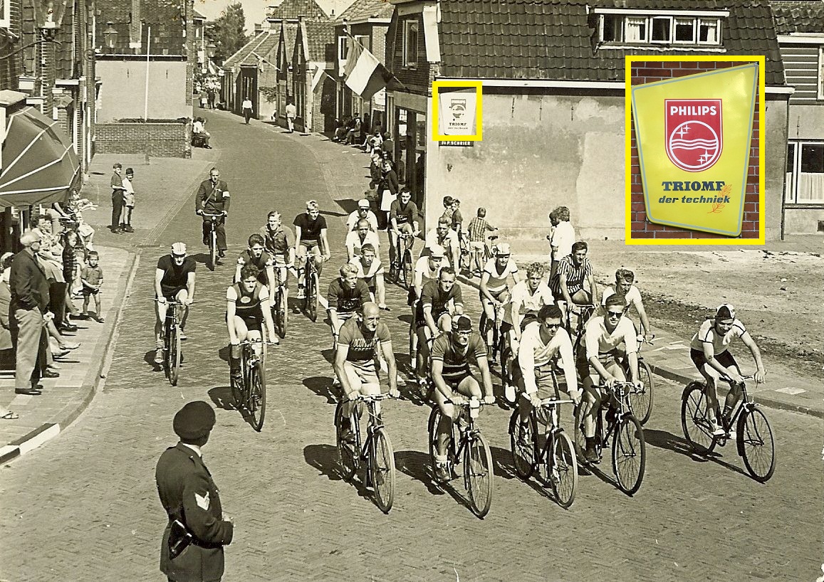 Het installatiebedrijf van Pieter Schrier rechts met het Philips-reclamebord: “Triomf der Techniek”. Zo’n zelfde bord hing ook iets verderop in de Molenstraat: klik hier.