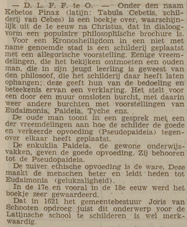 Hoe het daar in het Hof terecht gekomen is, mag Joost weten. Een tip van de sluier wordt misschien opgelicht door onderstaand artikeltje uit de Leidsche Courant van 14 januari 1938. Hier wordt geschreven over een andere versie van de Tabula Cebetis, een Leidse versie van ene Joris van Schooten, maar de eindconclusie is instructief: daar wordt aangegeven dat die versie feitelijk werd geschilderd in opdracht van de Latijnsche School in Leiden. Dat doet me vermoeden dat de ‘Noordwijkse’ versie in het Hof terechtgekomen via de Latijnsche School in Noordwijk. En het Hof van Holland was niet eens een misplaatste lokatie voor dit moralistische schilderij: er werd tot ver in de tijd officieel recht gesproken in de gelagkamer!