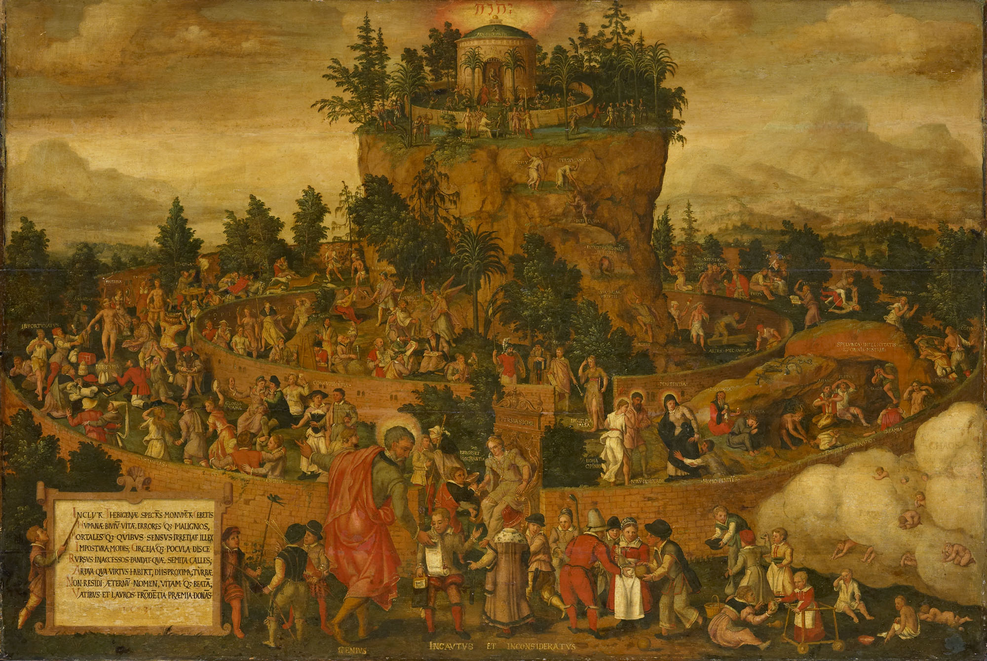 Het is een groot schilderij, 1 bij 2 meter en het dateert ergens van 1573. De schilder is onbekend, maar zeker is wel dat het hier een allegorische voorstelling betreft van de zgn. Tabula Cebetis. Cebes was een Griekse filosoof, leerling van Socrates, die zich een voorstelling maakte over de cyclus van een mensenleven, waarbij de mens in concentrische cirkels langzaam moest bewegen naar de eeuwige zaligheid, langs wegen die vol waren van verkeerde verleidingen, drempels en gevaren.