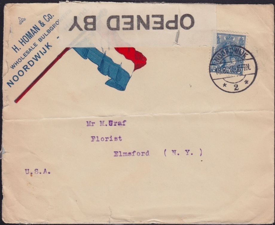 De brief is van 18 augustus 1916 en voordat die naar Amerika kon, moest er door de betrokken partijen eerst een blik in geworpen worden, want het was oorlog in die dagen en de brief was gericht aan iemand met een verdacht Duits-klinkende naam. De brief was afkomstig van de firma Homan, ‘wholesale bulbgrowers’ in Noordwijk. Volgens de telefoongids uit die dagen was er maar één kweker ‘Homan’ gevestigd in Noordwijk, en wel in de Kerkstraat op nommer 27. De naam van een ‘Homan’ in de Kerkstraat staat me nog vaag bij, maar helemaal plaatsen kan ik ‘m niet meer, helaas. Wel mooi briefpapier met die vlag.