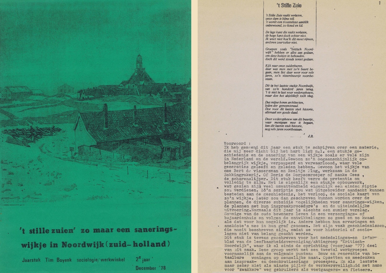 Sociologiestudent Tim Boyenk schreef in 1978 een klein werkstukje over het Stille Zuiden, “zo maar een saneringswijkje in Noordwijk (Zuid-Holland)”. Het stuk was ook bedoeld voor de Aktiegroep “Kritisch Noordwijk” . waarvan Boyenk al vanaf de oprichting in 1977 lid was. Het werkstuk staat integraal op internet als pdf en het zou aardig zijn om in retrospectief nog eens na te gaan niet alleen wat er fysiek van dit wijkje terecht gekomen is (dat weten we intussen), maar ook – en juist – in sociologische zin. Boyenk was één van de drijvende krachten achter een gepaste sanering van dit karakteristieke wijkje. Kees Verweij schreef er onlangs nog over: “Het is zeker geen kopie van het voormalige Stille Zuie, maar het ademt toch een bepaalde sfeer, zoals die vroeger ook aanwezig was.”