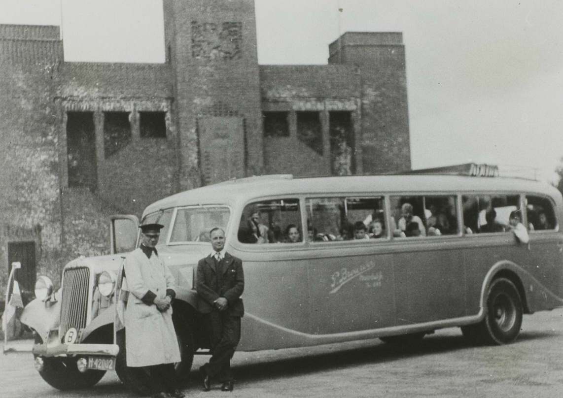Op de foto een klas met Leidse kinderen van de Aalmarktschool met schoolreisje naar de Zuiderzeewerken in 1937. Ze werden vervoerd door de firma P.Brouwer uit Noordwijk, die de voordeligste aanbieding had gedaan. Of misschien hadden ze in Leiden toen geen eigen touringcarbedrijf? De twee mannen linksvoor zijn waarschijnlijk de bovenmeester en – in de lange witte jas – de chauffeur van de bus (P.Brouwer zelf?).