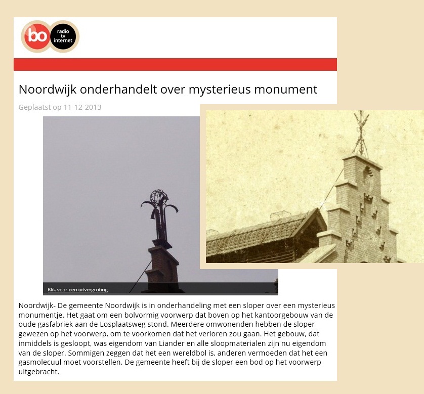 Los daarvan: het sierkunstwerk zou een wereldbol voorstellen of en gasmolecuul. Interessant is te onderzoeken wat het nu écht inhoudt. En ook wannéér het daar geplaatst werd. Want bij de opening van de gasfabriek in 1903 stond er een heel ander kunstwerk op. Is dat er vanaf gewaaid? Doorgeroest? Afgekeurd?