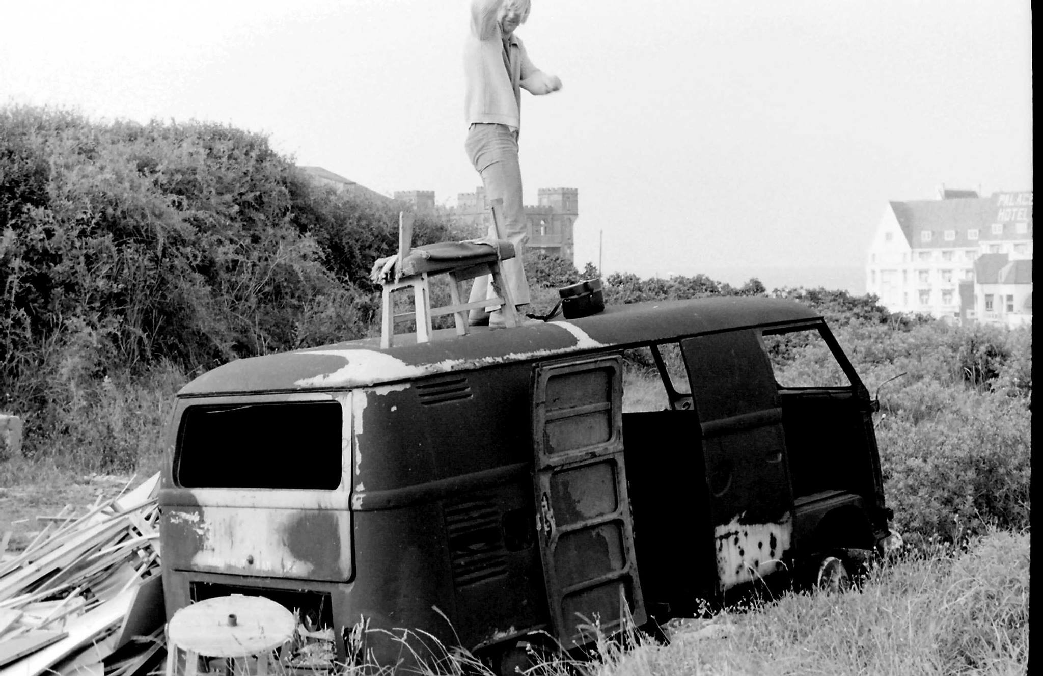 Kenneth Bestwell komt op “Je bent een Noortukker als…” aandragen met deze prachtige, bijna surrealistische foto. Een volstrekt uitgewoonde, c.q. uitgebrande VW Bus, gestrand ergens in de duinen (waar precies? ) en iemand die zich op het dak van de bus lijkt te gaan installeren (wie?). Op de achtergrond als ultieme verwijzing naar de ‘real world’: het Palace Hotel.