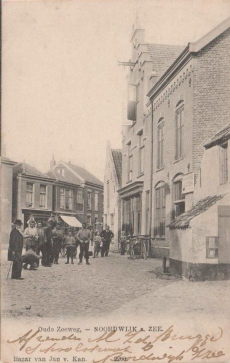 Het is een tafereel aan het eind van de Hoofdstraat, begin Calisplein. De vissershuisjes rechts worden langzaam opgeslokt door grotere bedrijfspanden. Het is 1910, Noordwijk heeft de definitieve “Umschwung” van een vissersplaats naar een badplaats gemaakt. De man links met de lange baard zal het allemaal een beetje hoofdschuddend hebben aangezien, maar terug kon niemand meer.