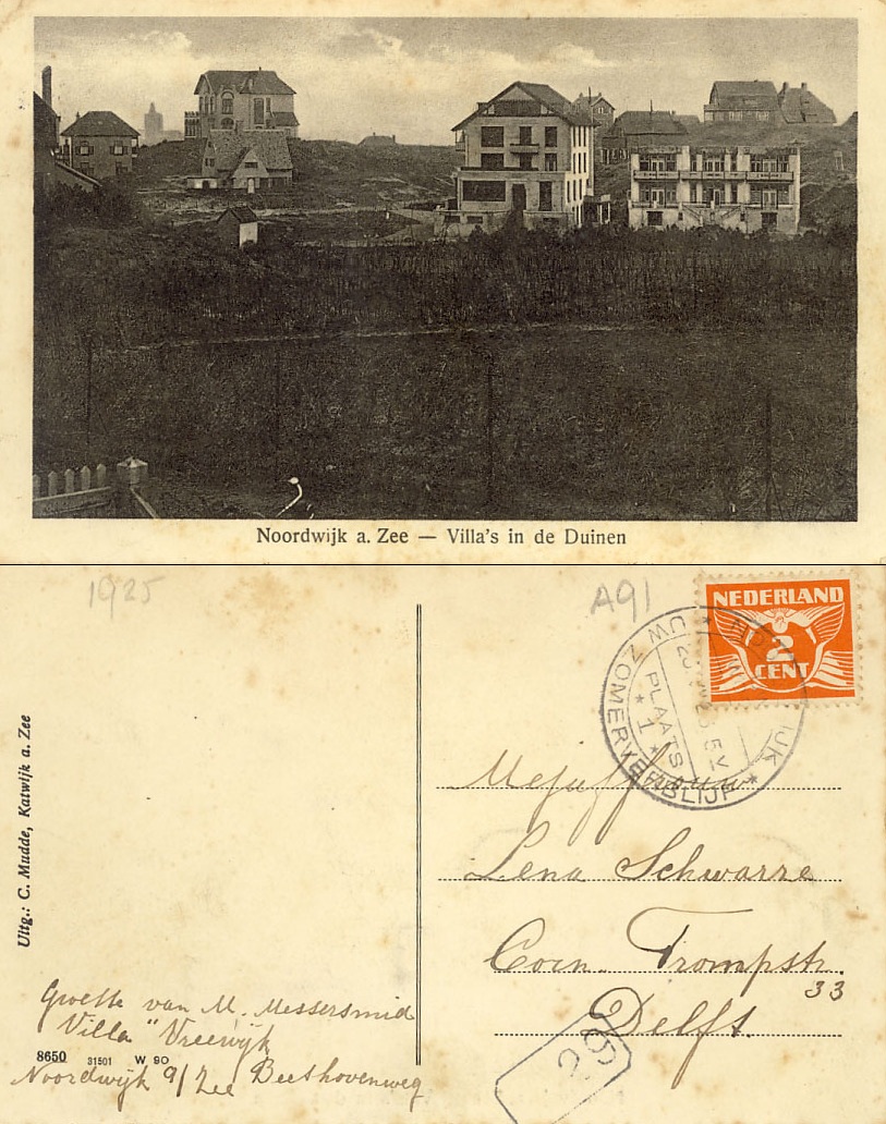De schuine kap op chalethotel “Duin en Dal” zou later sneuvelen, maar hier staat-ie er nog fier op, zoals een echt chalet betaamt. De foto biedt een mooi overzicht van het hele ensemble van de duinvilla’s achter de Rembrandtweg. De fotograaf had even zijn fiets neergezet en het plaatje snel geschoten. Zijn fiets is onderaan nog net in beeld. De toren van de Hervormde Kerk van Binnen is op de achtergrond nog te zien. Dichterbij dan je op het oog zou verwachten.
