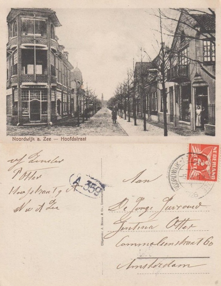 De kaart is afkomstig van ene P. Otter die woonde aan de Hoofdstraat nommer 9. Ik weet niet of dat nou links of rechts is op het plaatje, maar het adres moet hier zichtbaar zijn geweest. De man en vrouw rechts in de deuropening: misschien waren dat wel de heer en mevrouw Otter.